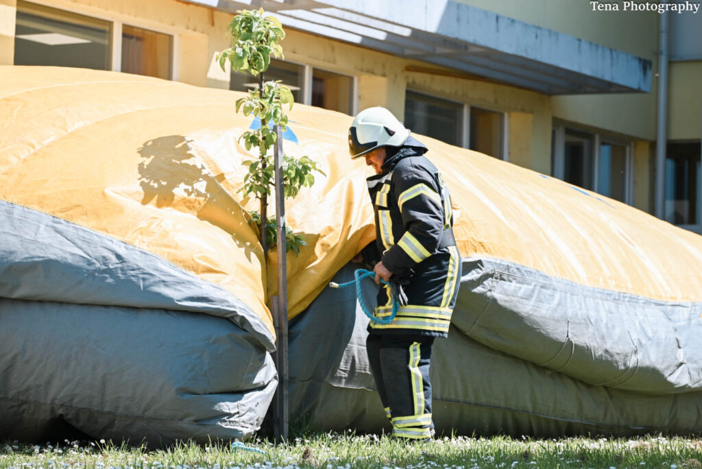 Pripadnici DVD-a napuhali su zračni jastuk na koji su skočili djelatnici i osoblje koje je ostalo zarobljeno u školi, dok su unesrećenog učenika iznijeli na nosilima.
